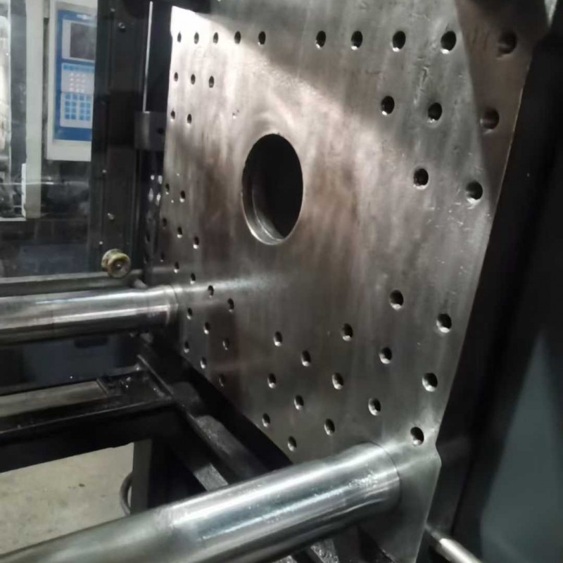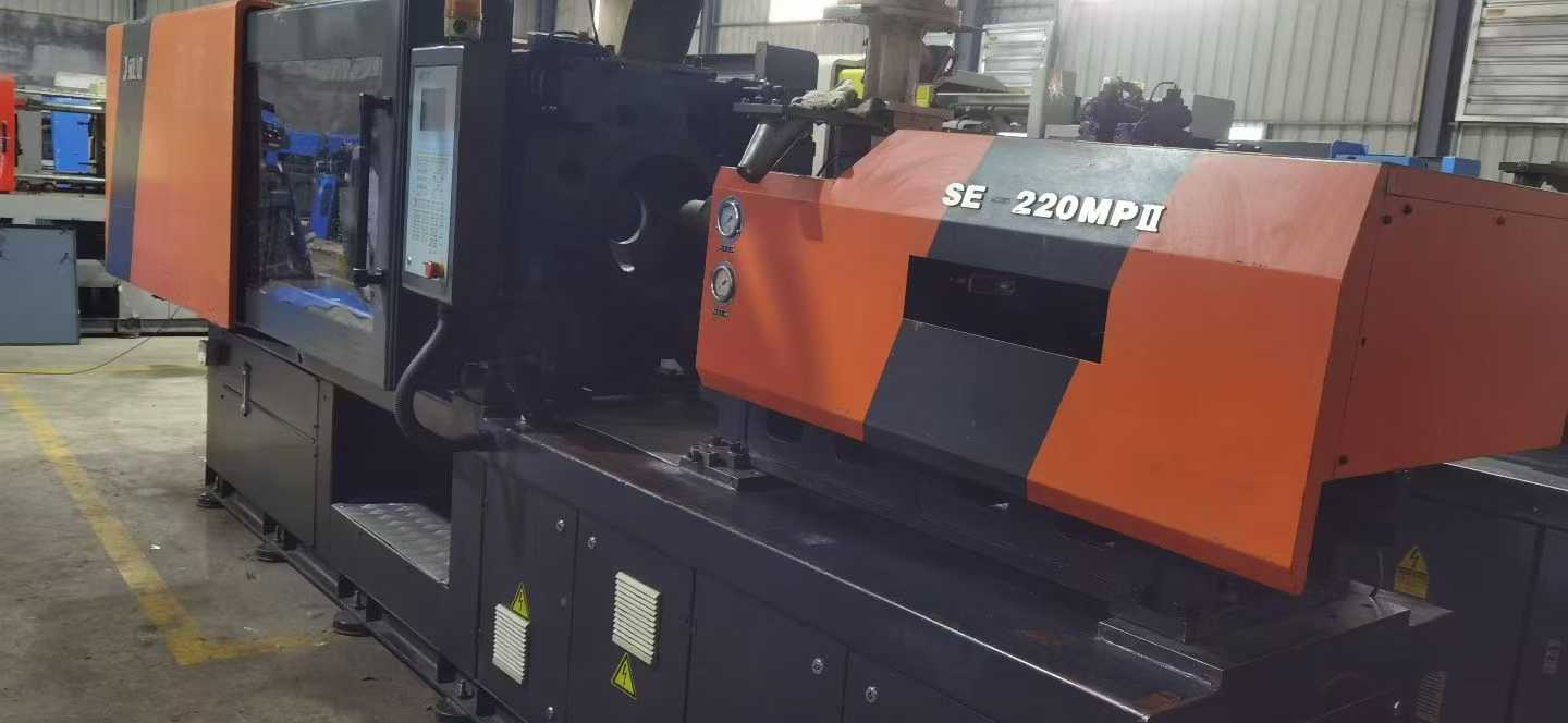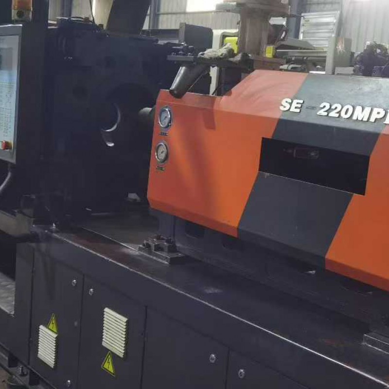 A Shen Da 220T enhanced 30 kW servo machine, featuring a 42-thread screw mechanism, is the preferred choice for precision products. It includes an oil system, a bucket, and a robotic arm.