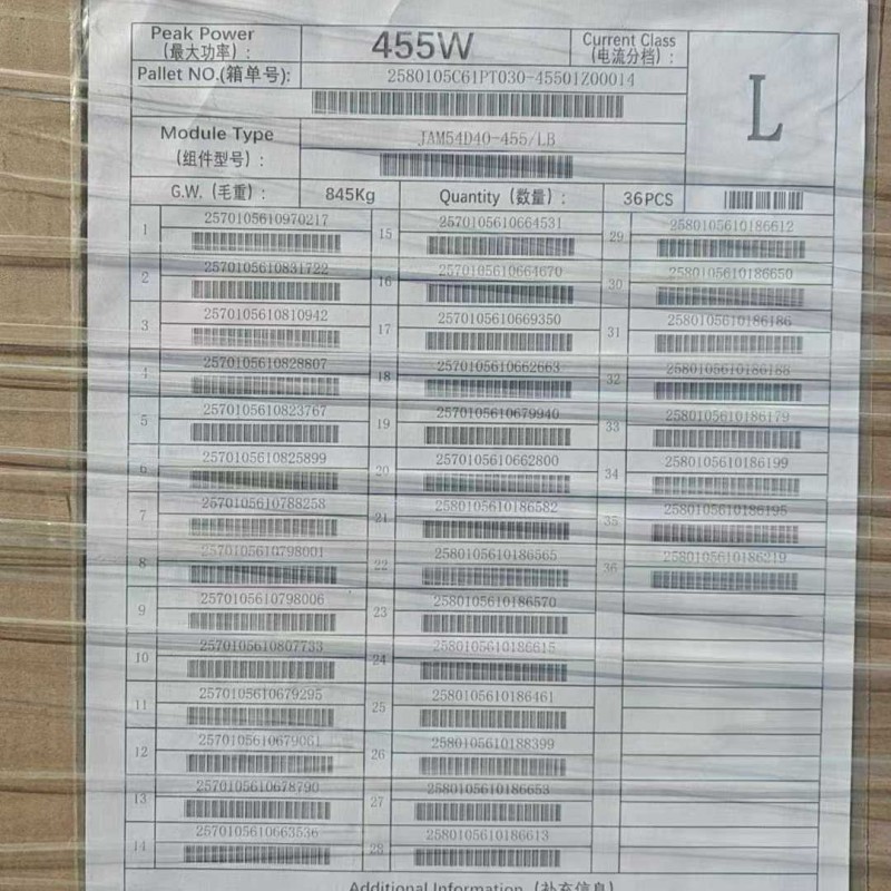 Jing'ao mini panels. JAM 54D40-LB 455/465 Quantity: 2,700 pieces.