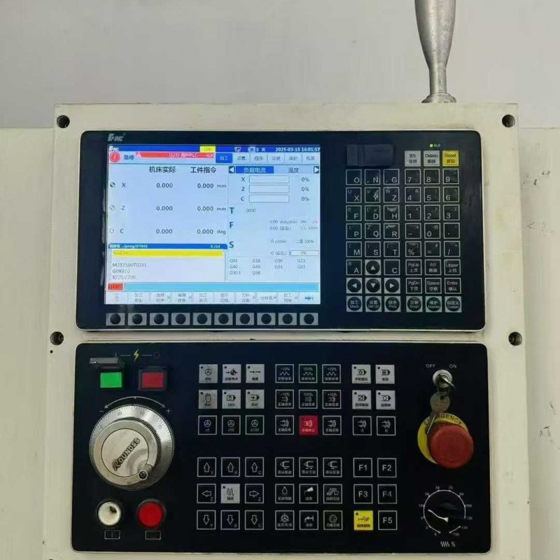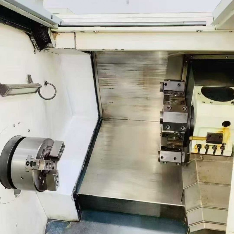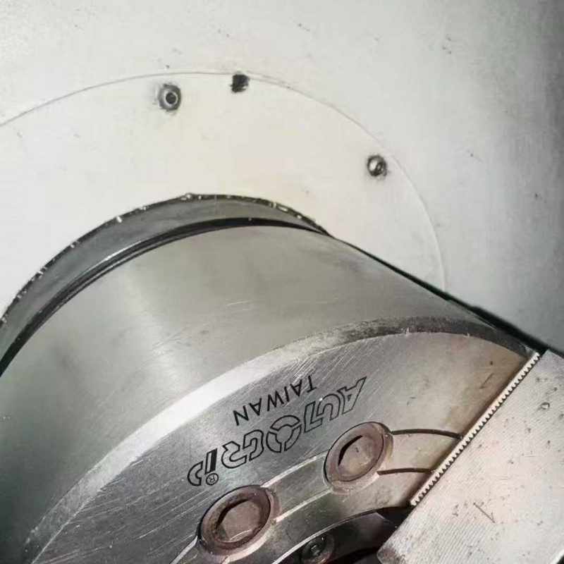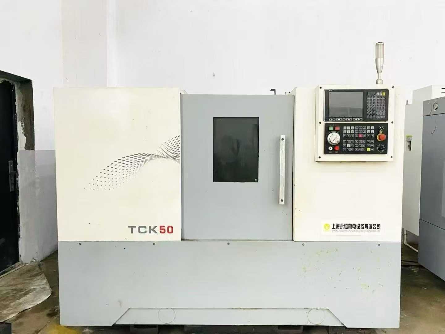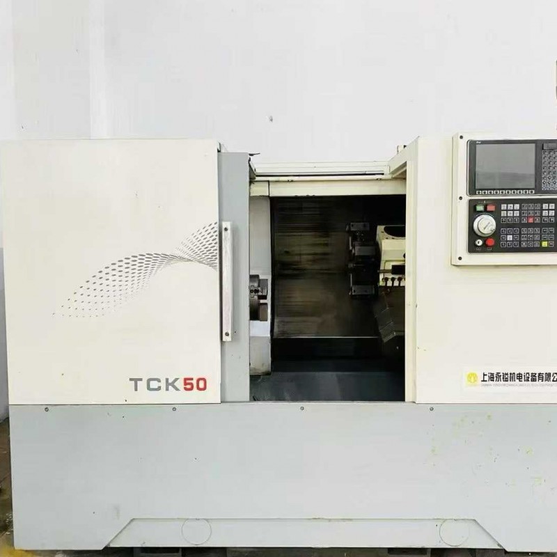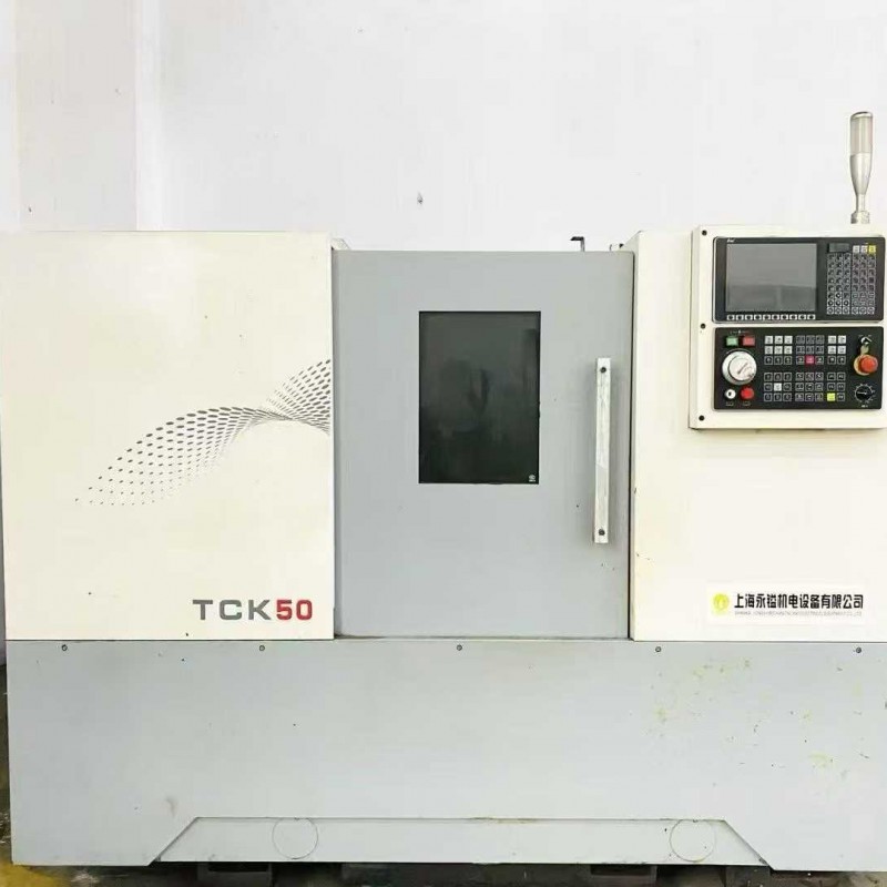 TCK50 inclined rail turret machine, equipped with a 8-inch Taiwanese Jiahe hollow hydraulic chuck, an 8-station hydraulic turret, the latest version of the Central China bus absolute value system, a 11kW servo main motor, and a two-rail system.