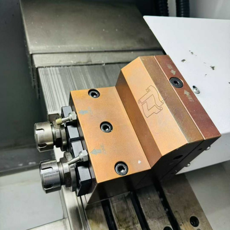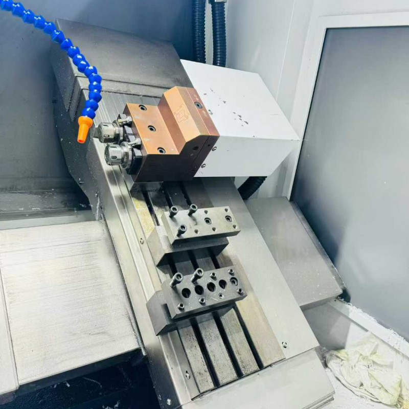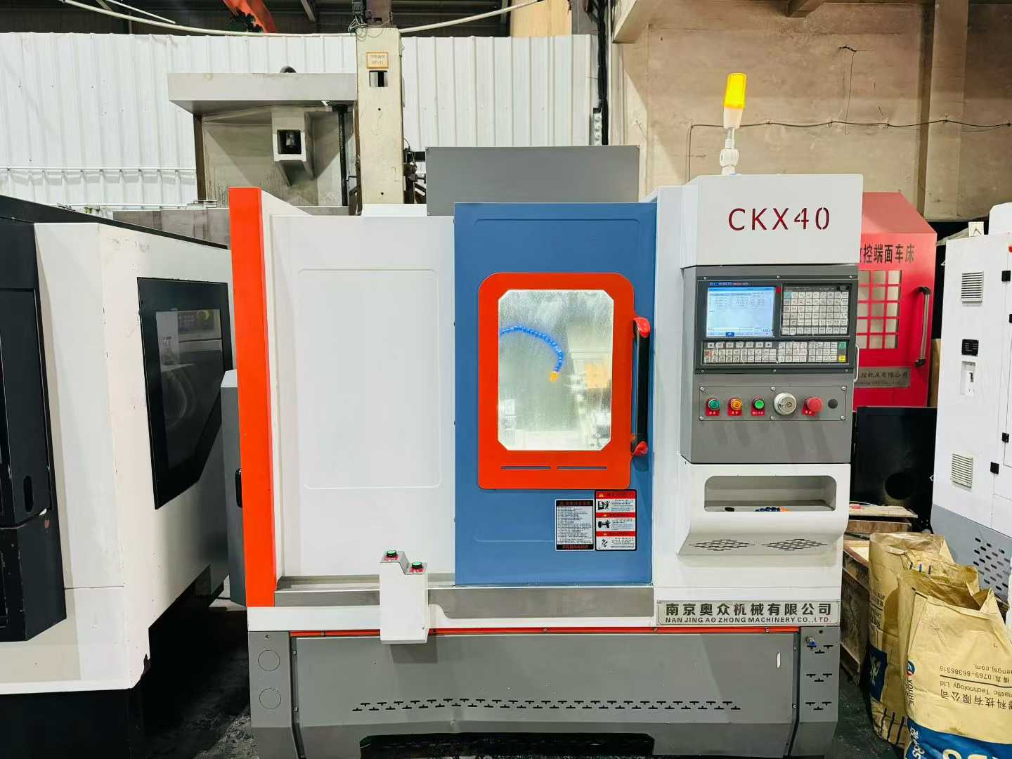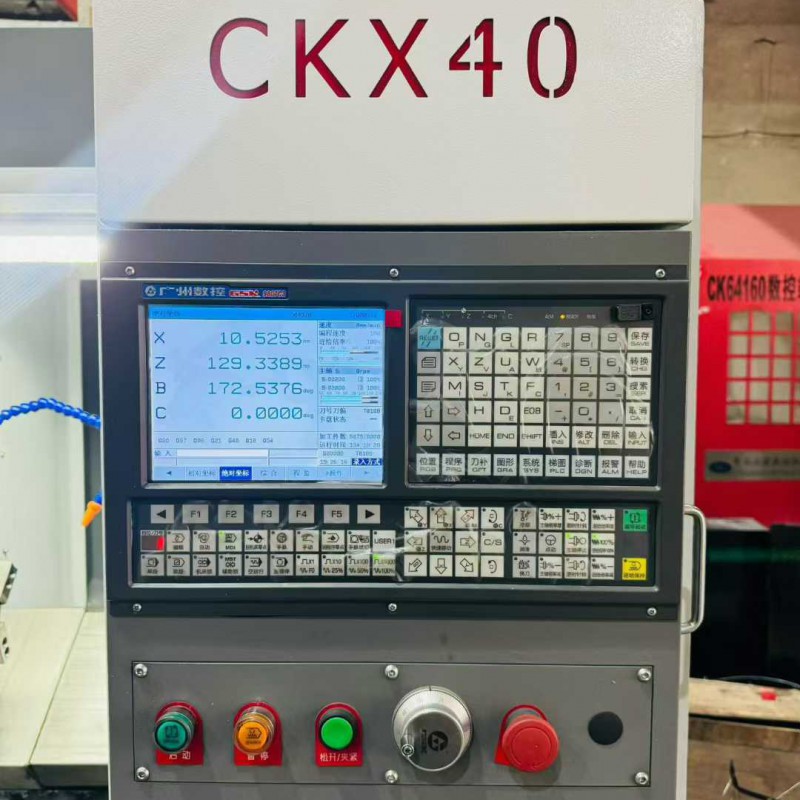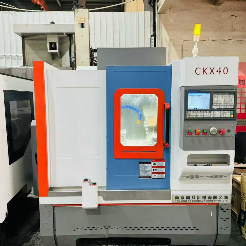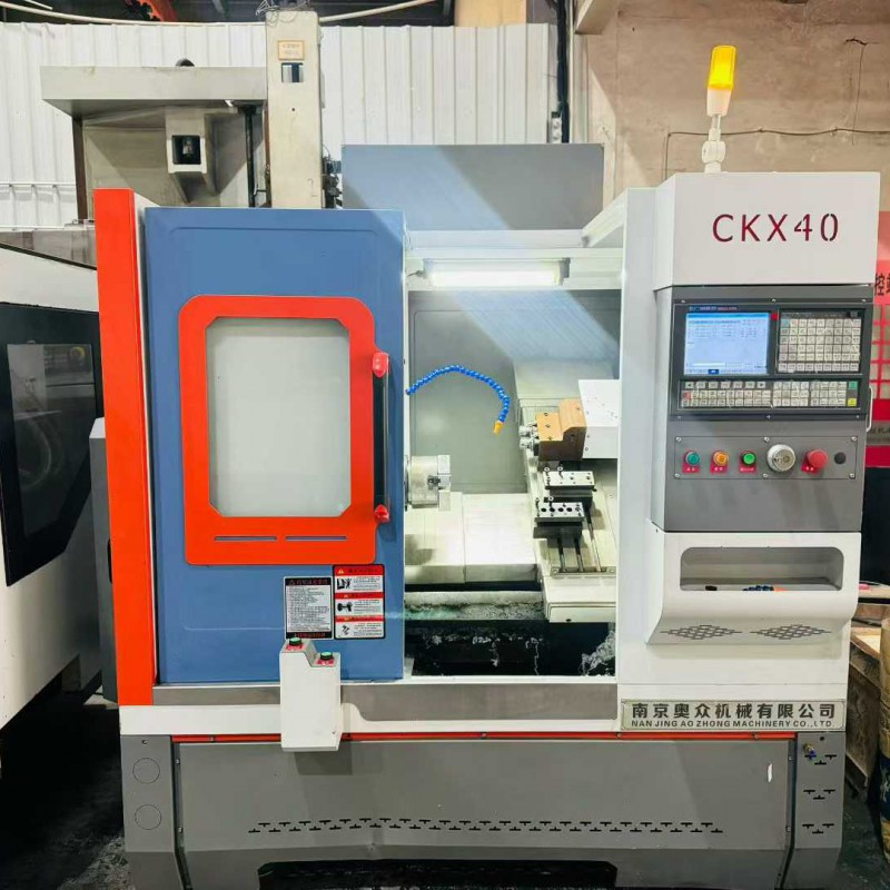 95% new Nanjing Aozhong CKX40 inclined rail knife changer, equipped with 2 ER25 end-face power heads, travel range X750. Z300., paired with a 6-inch hollow hydraulic chuck, Guangshu 980TC3 bus-type absolute value system, high-speed spindle unit.