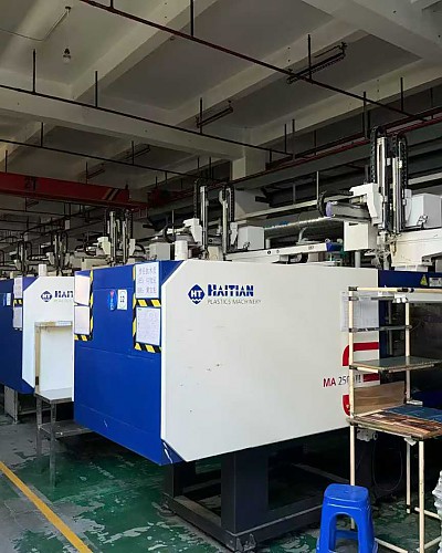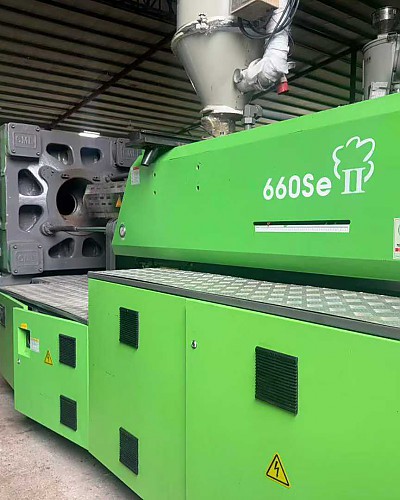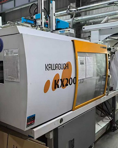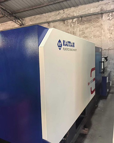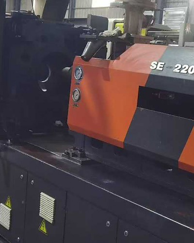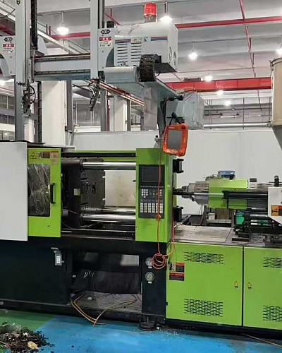 A Shen Da 220T enhanced 30 kW servo machine, featuring a 42-thread screw mechanism, is the preferred choice for precision products. It includes an oil system, a bucket, and a robotic arm.