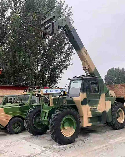 Diesel-powered four-wheel-drive all-terrain off-road telescopic fork truck, four-wheel steering, with side shifting capability. Lift height of 8 meters, operational life of 100 hours, complete lighting system.